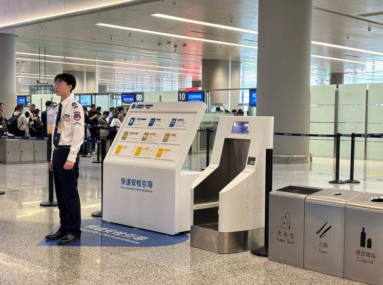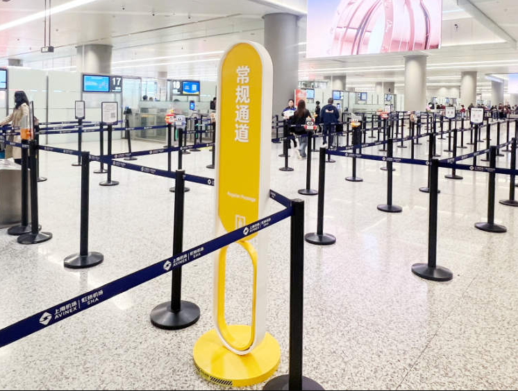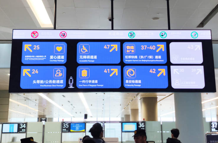 除此之外,虹桥机场还在安检入口前增设了通道引导大屏,各类通道信息一目了然;下方设快速引导台,工作人员现场答疑、核验资质,帮旅客精准“对号入座”。地面也铺上了色标导航地贴,不同功能区以色系区分,路线清晰又好认。